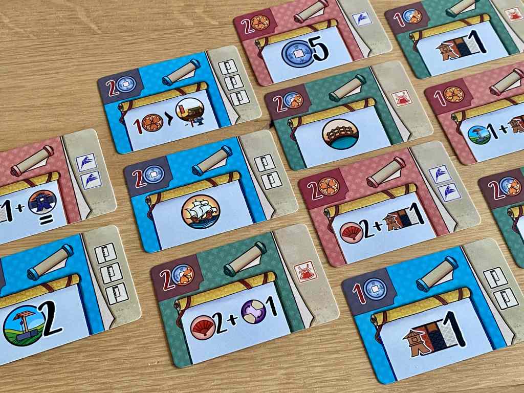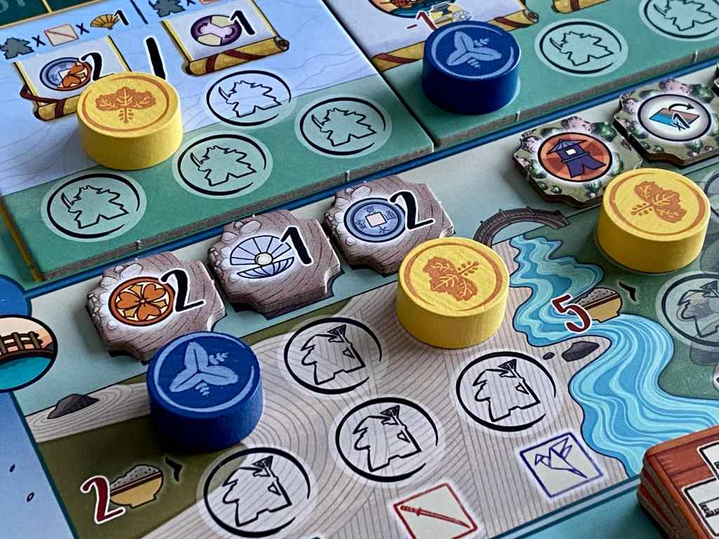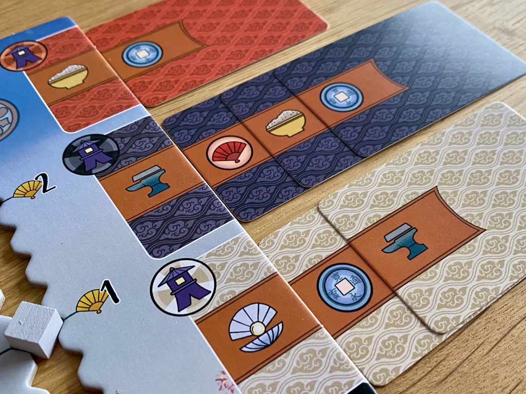 Chaque placement fait également récupérer les bonus Lanterne des participants. De trois couleurs, ils deviennent des éléments fondamentaux du jeu alors que cette option, dans le titre d’origine, n’était pas au centre de l’expérience. On pourrait penser que cette revalorisation aidant à obtenir de nombreuses ressources ou de l’argent fait diminuer la tension mais il n’en est rien. L’expérience est toujours aussi tendue. L’argent, les sceaux Daimyo, tout comme la nacre, le riz ou le fer réclament une gestion extrêmement serrée.