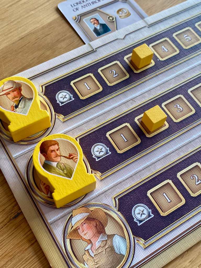 Ce programme ne peut pas être plus clairvoyant. On sait exactement ce que l’on fait lorsqu’on joue à THE ROYAL SOCIETY OF ARCHEOLOGY. De plus, la mécanique principale encrée sur du placement d’ouvriers presque classique est également « hyper » droite dans ses bottes. Je dis « presque », car le jeu propose dans plusieurs secteurs, des petites subtilités qui fondent son charme et sa différence. Aussi, toutes ces légères fantaisies proviennent de différents titres ayant fait grandement leurs preuves. Ainsi, le système d’expertise des explorateurs fait grandement penser à celui d’EGIZIA, les objectifs de fin de manche à atteindre sous peine de malus rappellent le principe de LORENZO LE MAGIFIQUE ou de GRAND AUSTRIA HOTEL, le décompte de points des objectifs personnels nous mène vers LES VOYAGES DE MARCO POLO, ou encore le mécanisme de bonus lors de la pose d’ouvriers, se rapproche de THE GALLERIST même si c’est un peu tiré par les cheveux, je vous l’accorde. Non, vous ne rêvez pas, RSA s’inspire ou emprunte tout un tas de petites babioles aux plus grands noms du jeu expert et tout le monde cohabite sur un même plateau avec richesse et harmonie.