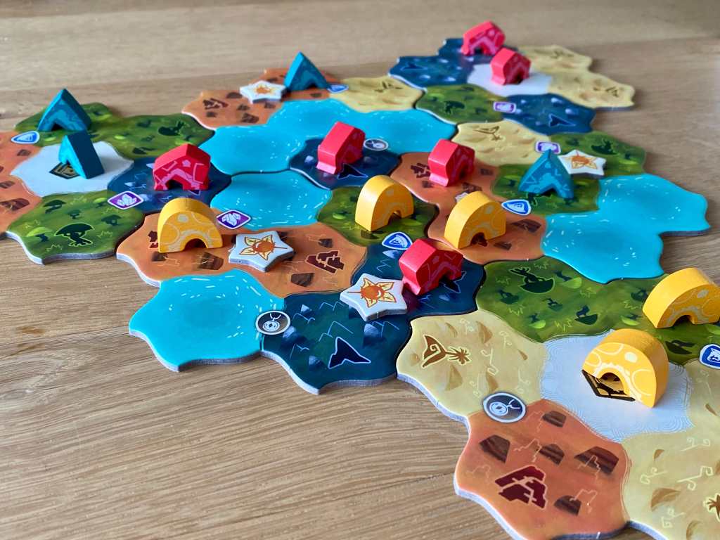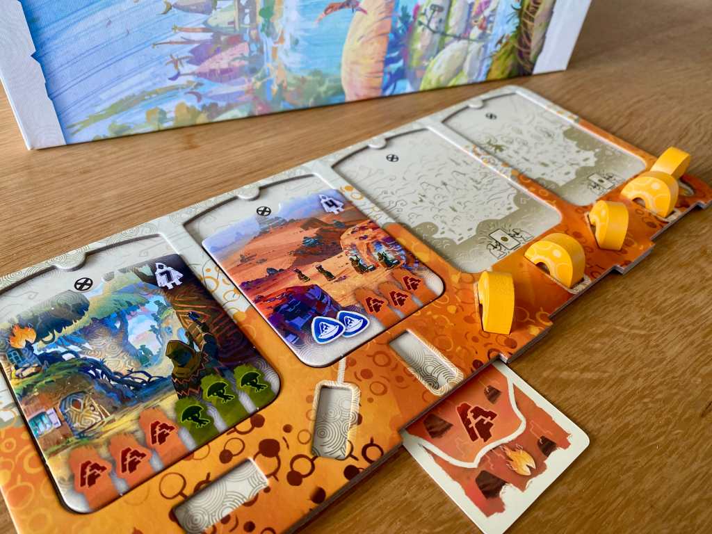 Difficile de ne pas évoquer, dans un premier temps, sa superbe direction artistique. L’illustration de couverture, bien qu’un peu trop chargée, fait rêver. Le matériel est impeccable, que ce soit dans la finition des jetons Camp en bois ou dans les plateaux joueurs double couche. Le jeu offre un réel plaisir à manipuler et à regarder. Même le thermoformage est optimal et permet l’inutilité du plastique.