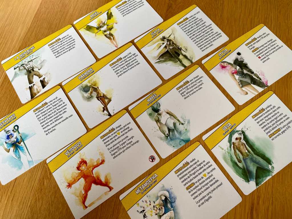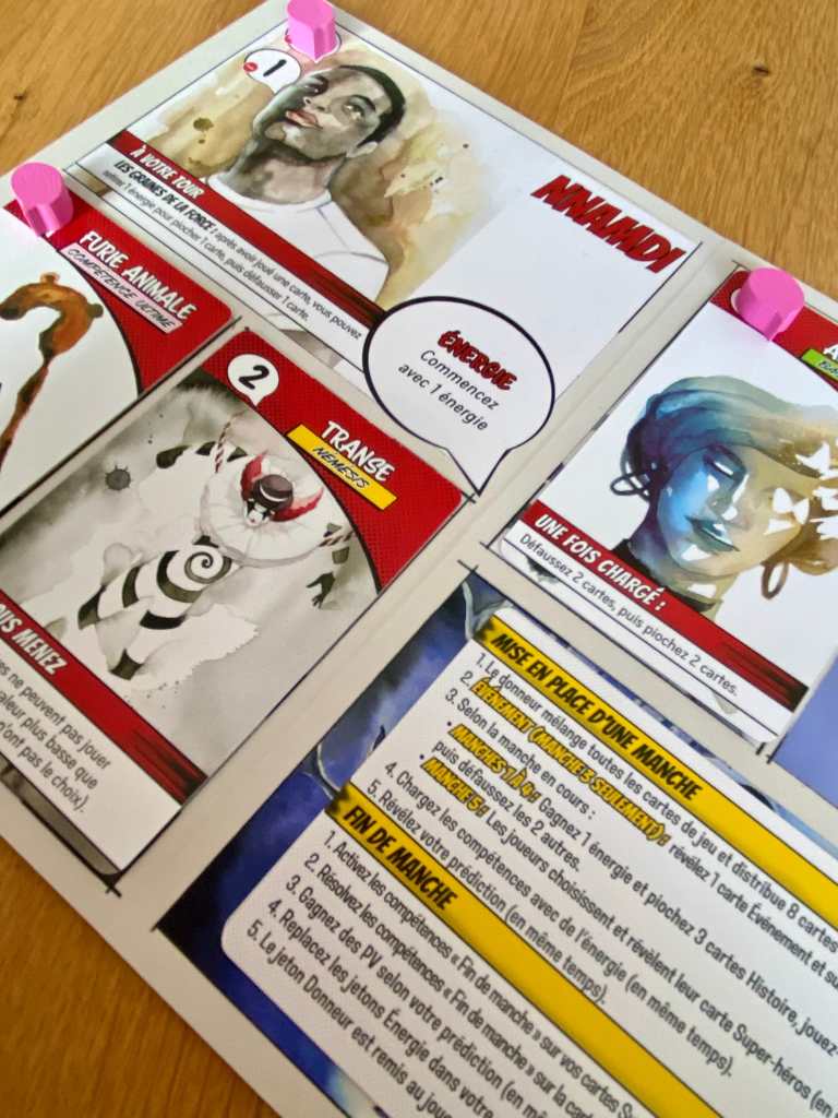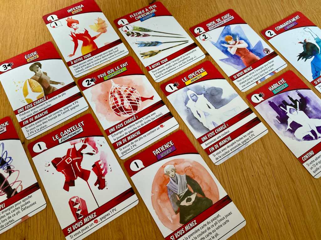 Les choix des joueurs ne se résument donc pas à jouer la bonne carte au bon moment, à suivre ou à couper. Non, il faut déjà penser à une façon spécifique d’obtenir des bonus, à une cohérence entre les pouvoirs à coordonner, à une façon de jouer globale avant de penser à gagner ou perdre des plis. Dit comme ça, le titre a l’air compliqué, mais en réalité, pas du tout ! Les règles sont accessibles et toute la richesse du jeu et la profondeur de réflexion proviennent des règles additionnelles qui débarquent au fur et à mesure et qui bouleversent tout.
