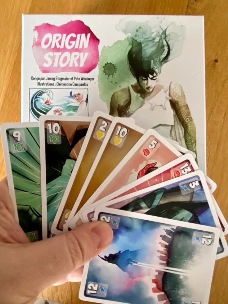 Oui, ORIGIN STORY est un ouragan dans le monde du jeu de plis, qui emporte tout sur son passage. Les autres jeux de plis, à côté, font pâle figure (excepté quelques gaulois irréductibles) devant sa modernité, l’énergie qu’il dégage et l’inventivité de son propos. Vous l’aurez compris, je suis dithyrambique. Le jeu sera, sans aucun doute, dans les meilleurs de cette année même s’il n’est pas à mettre dans toutes les mains quand même. En effet, il devient de plus en plus technique au fur et à mesure que les pouvoirs s’accumulent. Malgré un thème dont on se fiche éperdument et une direction artistique quelque peu floue, ORIGIN STORY est une bombe !
