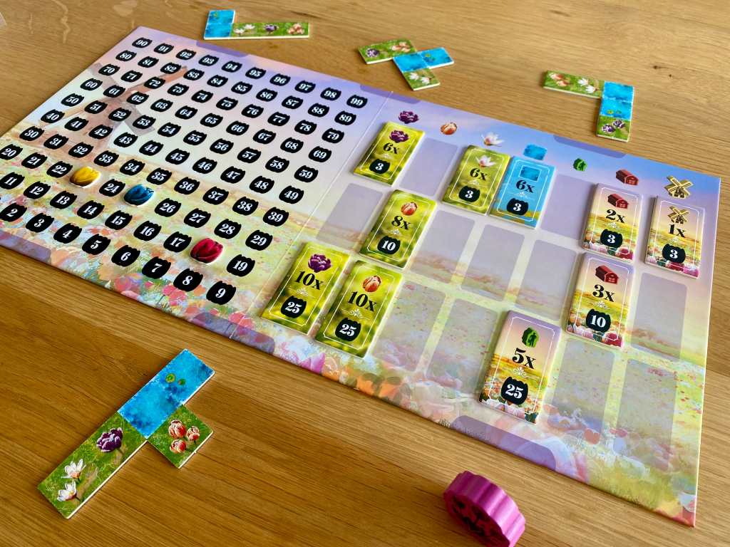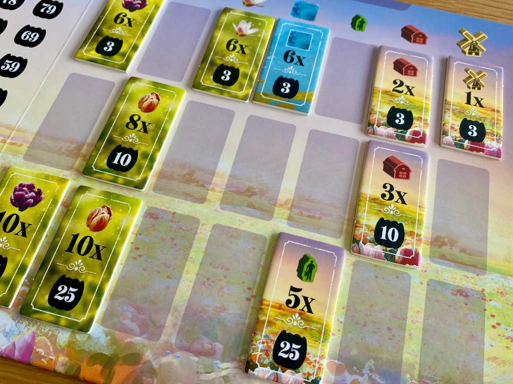 Et puis, FROSTED BLOOMS est aussi un jeu de course aux objectifs, qui changent d’une partie à une autre. Comme dans AUGUSTUS, les joueurs doivent choisir entre s’emparer immédiatement d’un objectif modeste ou tenter le gros lot, quitte à se faire doubler par leurs camarades. Les interactions indirectes sont bien présentes et donnent une vraie tension au jeu, dont le résultat se joue souvent dans un mouchoir de poche.